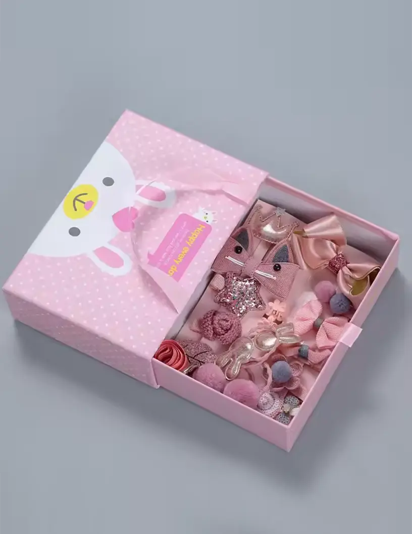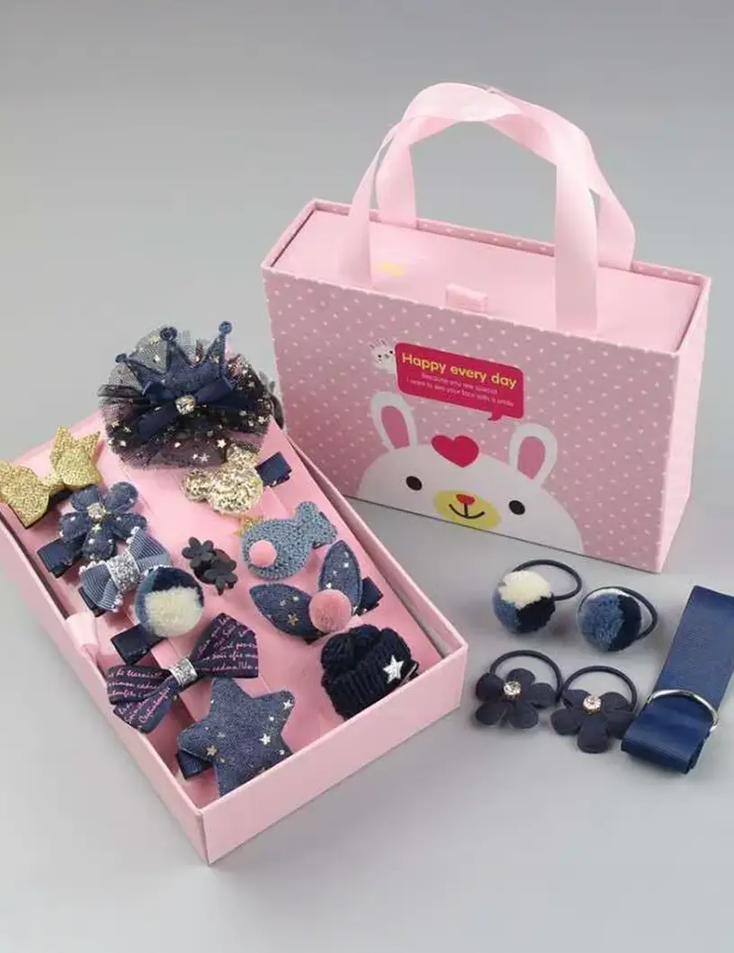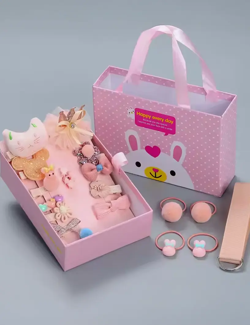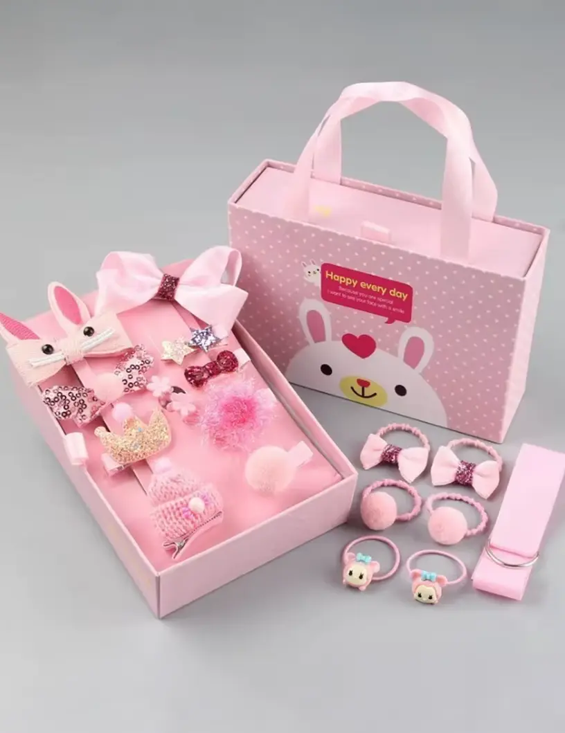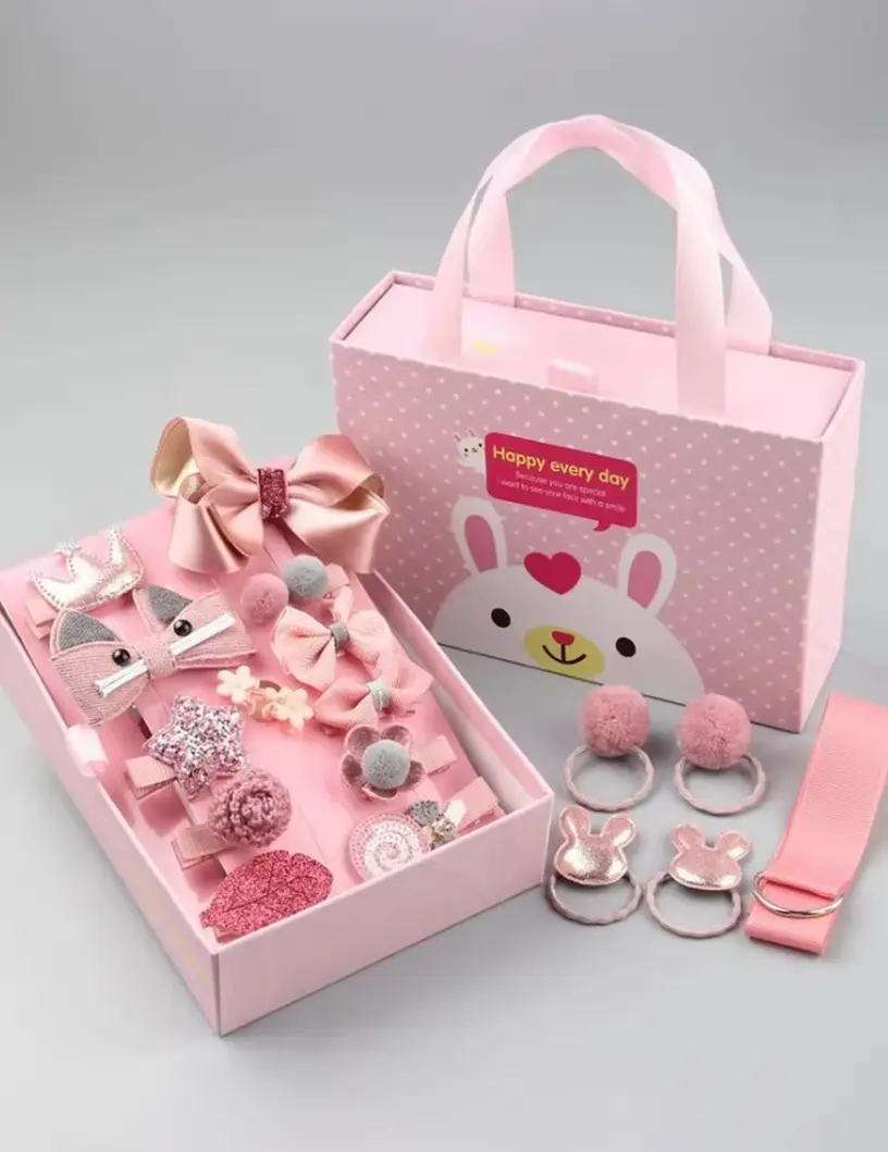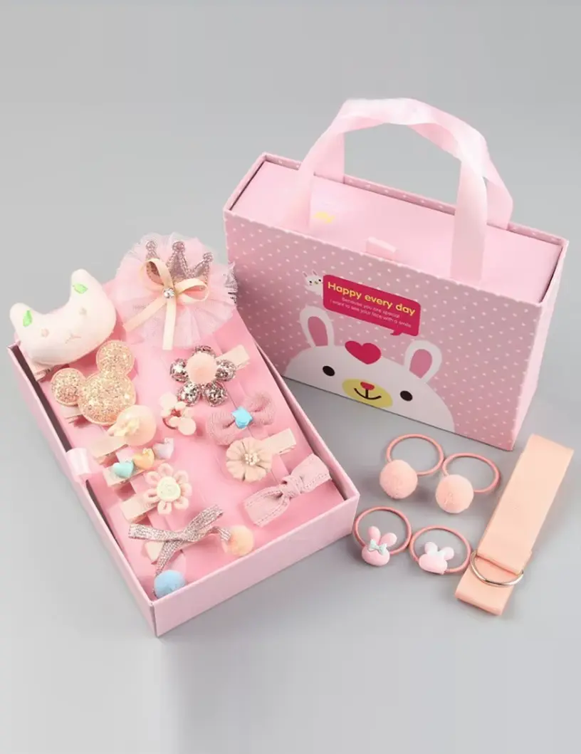 Caja de accesorios para el cabello presentada en un estuche rígido con manija. El diseño del estuche es alegre y delicado, con un dibujo infantil. En su interior incluye una variedad de accesorios: hebillas con formas divertidas, moños, colitas, vinchas y adornos en distintas texturas y materiales.