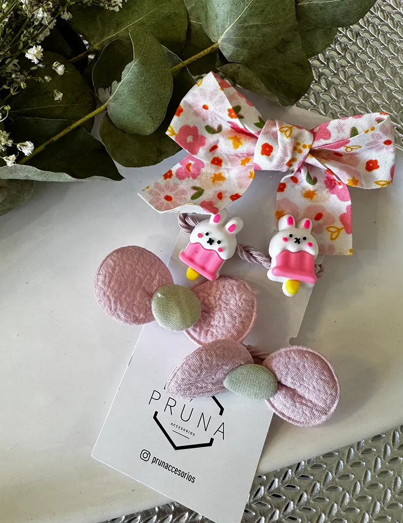 Set de 3 chuflines: moño gigante, conejitos y par de moños rosas.