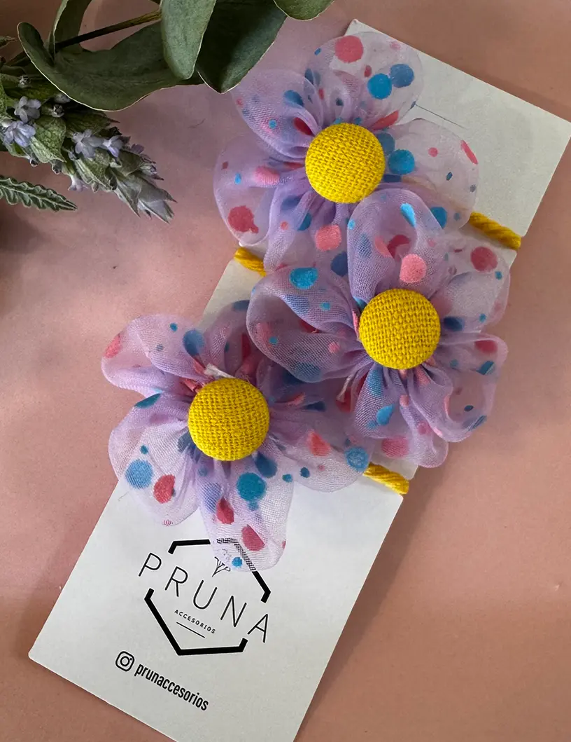 Set de 3 chuflines de flores violetas.